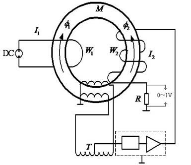 采用磁性比较方法,M为高导磁率材料铁芯,、为比例绕组,、分别提供给、直流电流。得到的直流磁势分别为, ,由于两个磁势和方向相反,当时,即铁芯内合成磁通为零时,磁势平衡方程为,且当时,.上述说明,即使是一个数值较大的单个电流,只要有足够的匝数,便可以用较小的与之平衡,并可用表示相应的数值,数值较小,便于直接进行精密测量,且为常量不受其他量的影响,因此用磁性比较方法测量直流大电流可以达到较高的精度。同样风速、太阳辐射量等信号的测量选用与光伏发电系统相配套传感器和变换器将信号其转换为标准电信号才能送入数据调理单元。