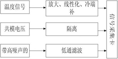 直接采集来的信号由于噪声等原因不一定能够满足采集系统的要求,为了适合数据采集设备的输入范围,由传感器生成的电信号必须经过处理。信号调理装置能够按照要求放大或者缩小电压电流范围,并对信号进行隔离滤波等处理。光伏监测系统的信号调理图如图3所示。