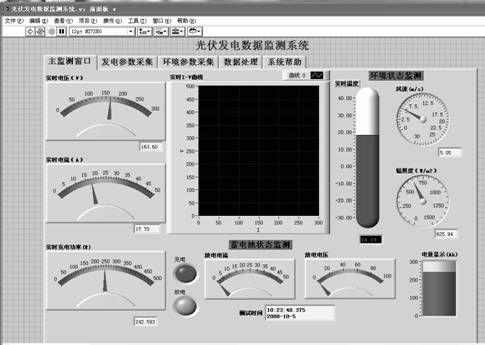 由于Labview使用G语言(图形化语言)进行程序设计,因此该系统界面包含了光伏发电监测系统所要进行监测的温度、电流、电压以及辐照度等的全部信息,Labview中的VI程序由前面板、程序框图、VI图标3部分构成,其中前面板是VI 程序的用户操作界面,是VI程序的交互式输入和输出端口。如图4所示,系统前面板即系统界面主要由主监测界面以及各种参数界面组成。主界面主要由发电参数监测模块、环境参数监测??楹褪荽砟??部分组成,各独立参数??榭梢越杏泄氐牟问柚?,实时显示数据,数据处理??榭梢源娲⑾喙氐睦肥莶⒔惺莼胤?,以便对特定??榈ザ澜蟹治龃怼?