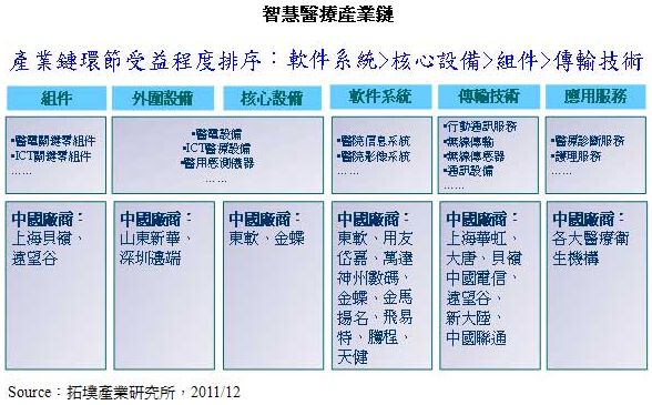 除智能电网之外,蕴藏1,200亿元人民币商机的智能医疗产业,也是台厂切入大陆物联网市场另一个机会点。大陆“新医改”将配合“健康中国2020”发展目标,以政策为导向推动改革规划,十二五期间将投入8,500亿元人民币,循此战略规划全面提升中国大陆医疗水准。