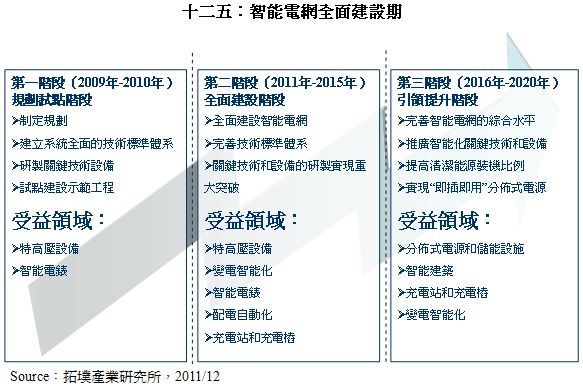 十二五期间是智能电网的全面建设期,将积极建立技术标准体系,以及关键技术和设备的研制。受益领域包括特高压设备、变电智能化、智能电表、配电自动化,以及充电站和充电桩。其中智能变电是物联网应用中投资力道最大的环节,市场规模达740亿元人民币,是十二五期间智能电网的投资首选,企业的技术与通路能力是胜出关键。