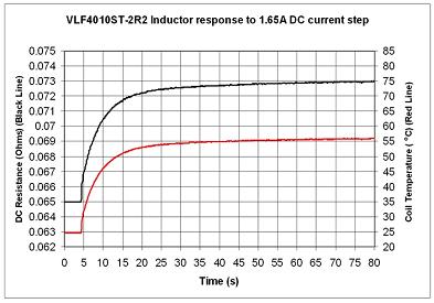 图5中所示的测试示例在LM3554的电路中使用了VLS4010ST-2R2,直流电流阶跃为1.65A。室温时的电阻开始时为65mΩ。超过30秒之后,电感器达到稳态,电阻变为73mΩ,相应的稳态工作温度大约为 56℃。