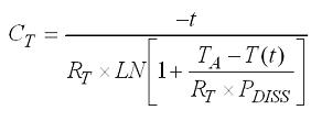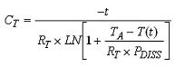 该模拟可以深入进行,以描述器件的另一个热属性,称之为热容。正如将热阻模拟为电阻,可以将热容(CT,单位为J/℃)模拟为电容。将热容与热阻并联获得热阻抗(ZT)。图1所示为传导传热的简化RC模型。能源被模型化为电流源,热阻抗被模型化为CT与RT并联。