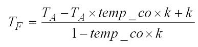 这里要注意的一件事情是电感器的功耗是其线圈电阻的函数,后者会随着温度发生变化。因此,需要考虑计算电感器在给定RT的TF。将RT的等式插入电感电阻与温度等式并求解TF可以得出: