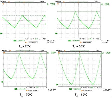 图4左上图显示了在饱和点以下工作的电感器,具有正常的三角电流波形,可由(V/L×Δt)算出。在峰值电流保持相同且温度升至50℃(右上图)时,电感电流斜率开始增至1.76A标记附近,指示显示电感器的饱和点随着温度上升而向下移动。当温度升到70℃, 然后升到85℃时,随着电感器达到饱和整个电流波形最终出现。