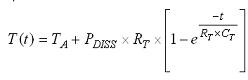 在稳态下,LEDI/NTC的ESD二极管的VF为-622mV,对应结温 95.2℃(环境温度为25℃时)。在稳定状态下,测得的PFET导通电阻为154mΩ,对应结温105℃。图3 还描绘了LM3554的热容。VF和RPMOS的响应表现呈现类似于一阶RC的指数级上升,计算等式如下:
