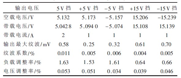 测试仪器采用固纬4 位半数字万用表(GDM-8245) 、上海爱仪交流毫伏表(AS2294D) 和调压变压器(TDGC -0.5/0.5) .负载电阻采用水泥电阻(2.5Ω/20 W、5Ω/20 W、15Ω/20 W) .电源性能参数如表1 所示??梢钥闯觯?负载调整率和电压调整率反映出了电源较高的稳定度, 纹波系数指标反映出低纹波特性。