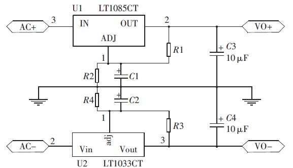 LT1083/LT1033 系列正负可调稳压器的效率大大高于现有器件,可以提供7.5 A、5 A 和3 A 输出电流,并能在低至1 V 的压差条件下运行,压降在最大电流条件下保证在1.5 V 以内。负载电流减小时允许压差同时减小,可在多种电流水平条件下通过片内修整电路,提供所保证的最小压差,并能够使输出电压准确度调节至1%.其电压调整率为0.015%,负载调整率为0.01%,对电流限值也进行了修整,最大限度地减小了过载条件下稳压器和电源电路上承受的应力,具有热功耗限制?;10].LT1083/LT1033 系列器件的引脚与老式三端稳压器兼容,与大多数稳压器设计中的10 μF 输出电容器以及PNP 稳压器多达10%的输出电流作为静态电流消耗不同,LT1083/LT1033 系列的静态电流流入负载, 大大降低了电源功耗。此芯片电压调整率小、负载调整率小的特点能够保证输出电压稳定度高。正负线性稳压??榈缏啡缤? 所示,其中R1=R3,R2=R4.电路中的电阻参数可根据输出可调电压公式确定: