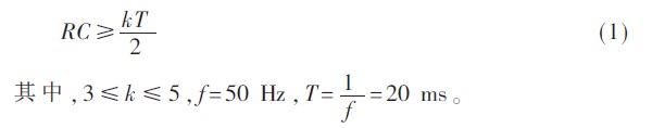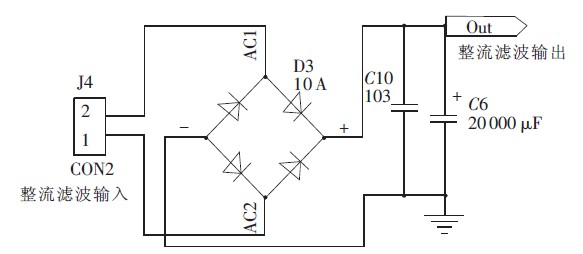 整流滤波电路主要由整流桥堆和大容量滤波电容组成, 如图2 所示。整流桥堆具有体积小巧、输出电流大、安装方便等优势, 并能代替由4 只二极管组成的传统桥式整流电路。滤波电路采用大容量电解电容滤波,增加了输出电压的稳定性。根据式(1) 可求出所需滤波电容容量。