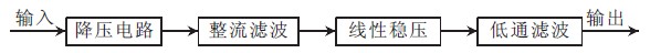 本设计由降压???、整流滤波???、线性稳压??楹偷屯瞬?樽槌?, 如图1 所示。变压器将220 V/50 Hz 交流电分别降压到±16 V、±6 V、+6 V, 通过整流桥堆整流以及大容量电容滤波后, 进入正( 负) 线性稳压???, 再经过低通滤波??槁顺绷饕酝獾母扇判藕?, 分别输出±15 V、±5 V、+5 V 的稳定电压。