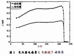 变压器在中不仅能传递能量,同时还起到了电气隔离的作用,变压器的原边与副边线圈匝数比的不同可以达到升压或降压的作用。在??楣ぷ髯刺?,由于磁芯的涡流效应,变压器会产生很多的热量,成为??槿攘坎闹饕丛?。实验中首先测试了变压器原边和副边线圈的电感量随温度的变化,如图3所示,从图3中可见随着温度的升高,线圈的电感量先增加,然后小幅下降,再小幅上升,在环境温度为220℃以前,变压器的原边与副本电感量的整体趋势是逐渐增加,当温度达到220℃,磁芯温度达到居壁点,线圈的电感量迅速降为零。对于不同磁芯材料的变压器其居里点温度有所不同,对于此类变压器,可知居里温度在220℃附近。当变压器温度接近居里点时,变压器电感量会迅速减小,会导致输出电压迅速下降。