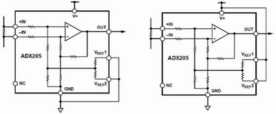 双极性输出时AD8205可以测量流过采样电阻上的双向电流,这时,输出可以偏置到输出范围内的任意位置。当被检测的正反两个方向上的电流为等幅时,其输出必须偏置到满量程输出的中间位置。当双向电流幅值不对称时,输出偏置可以对应地偏离半量程位置。它的两个参考输入VREF1和VREF2分别连接一个内部电阻RREF后接到同一个内部偏置节点,这两个参考输入端的操作方式完全相同。在两个参考电压输入端接入对应的电压,即可完成对输出的偏置。在双极性输出方式下,一般有以下两种连接方式。