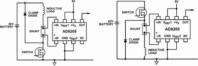 如图4(b)所示连接,PWM开关和采样电阻都位于电压高侧。当PWM开关打开时,负载电源将被移除,但仍然可以提供和监测续流电流,以实现电流控制诊断。在工作过程中,大部分时间电源都和负载隔离,这样可将负载对地之间的差分电压所引起的不良影响减到最小。当PWM开关闭合时,电源电压将连接到负载,这时共模电压将增加到电源电压。而PWM开关打开时,电压将反转并经过感性负载,由于续流二极管的作用,使得采样电阻上的共模电压保持为一个低于地的二极管的导通压降。