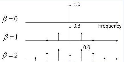 图1显示了通过正弦波改变调制指数产生的影响。当Β=0时,没有出现频移,只有一条谱线。当Β=1时,频率特征开始延伸,且中心频率分量下降了20%。当Β=2时,该特征将进一步延伸,且最大频率分量为初始状态的60%。频率调制理论可以用于量化该频谱中能量的大小。Carson法则表明大部分能量都将被包含在2*(Δf+fm)带宽中。