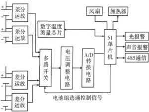 具有高电压、高容量、循环寿命长、安全性能好等优点的锂离子电池,在便携式电子设备、电动汽车、空间技术、国防工业等多方面具有广阔的应用前景。由若干节锂离子电池经串联组成的动力锂离子电池组目前应用最为广泛。由于每节单体电池的电压不一致,使用中电池不允许过充电、过放电,电池的性能和寿命受温度影响较大等特点,必须对串联锂离子电池组进行监测,确保在使用中锂离子电池具有良好的状态,或者使用中电池出现问题立即报警,电源管理系统立即采取保障措施,并提醒相关人员检修。单体电压和电池组的温度是辨别串联锂离子电池组是否正常工作的主要技术指标。文献[1]采用直接采样法,将要测量的单体电池电压存储在非电容上进行测量。该方法反应时间慢、误差较大、控制复杂;文献[2]采用运放和光藕继电器来测量串联电池组的单体电压。该方法对光耦的线性度要求很高,导致硬件成本较高。目前,直接采用集成芯片的串联锂离子电池组监控系统受到青睐,但该方法串联电池的数目固定,导致应用不灵活、硬件成本高等缺点。文中研制了一种动力锂离子电池组监测系统,对串联锂离子电池组的单体电压和电池组的温度进行在线监测,当单体电池电压偏离规定区间时,监测系统启动报警程序进行声、光报警;当电池组温度偏离规定的区间时,监测系统启动风扇或加热控制电路,并存储有关数据,确保电池组正常工作。整个监测系统具有连续测量分量、简单经济、精度高和可靠性高的特点。