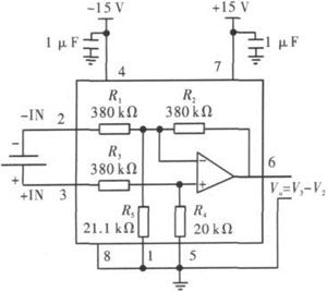 INA117内置了380kΩ、20kΩ和21.1kΩ 3个电阻,因此外部电路省去精密电阻,减少了精密电阻带来的误差和系统复杂程度。图2是INA117输出1节电池电压的接法,6脚和1脚之间的电压就是1节电池两端的电压差。