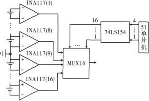 每节锂离子电池最高电压为5V,由图3可得,第1个INA117的3脚的输入电势最高为40V。同理,第16个INA117的2脚输入电势最低为-40V。第1至8个INA117的输出电压为正,第9至16个INA117的输出电压为负,所以多选一模拟开关和A/D转换器都要求可以输入正、负电压。多选一模拟开关选用MUX16,为16选1可正负电压输入模拟开关,因此16节电池只需1个MUX16.但由于单片机IO口有限,文中用一片74LS154扩展了IO口,仅用单片机的4个IO口即可控制MUX16分别选通单节锂离子电池进行电压采样。