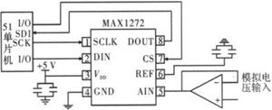 图4中MAX1272采用了内部参考电压,6脚VREF 和地之间接2.2μF钽电容和0.1μF陶瓷电容。