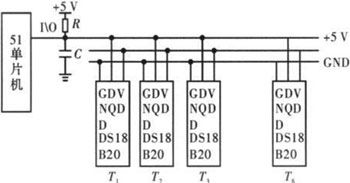 针对串联电池组,传统的测温方法多采用模拟温度传感器进行测量,在数据的采集和传输过程中易受外界环境的干扰,从而使测得的结果误差较大,且当测量点较多时,连线较复杂。文中采用单片机和单总线数字式温度传感器DS18B20来解决上述问题[5]。其原理如图5所示。