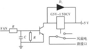 电路如图6所示,FAN为低电平时,晶体管9014不导通,此时继电器无动作;当FAN为高电平时,晶体管9014导通,使得继电器触点吸合,风扇在24V电源电压的供电下开始工作。