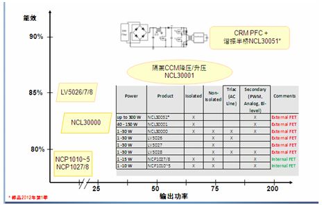 在安森美半导体用于LED照明的AC-DC电源方案中,1至10 W的照明应用中推荐使用NCP1010~5,1至15 W可使用NCP1027/8,这些方案集成了MOS管,适用于隔离和非隔离应用,支持次级PWM调光、模拟调光或双亮度等级调光,能效高达75-80%;1至30 W的应用可以使用LV5026、5027、5028,支持隔离方案,典型能效85%左右;1至40 W推荐使用NCL30000,可进行初级可控硅调光,适用于隔离和非隔离方案,隔离方案能效80-85%。40至150 W推荐使用NCL30001,它是一个连续导电模式(CCM)控制芯片,隔离方案的典型能效85-90%;更大功率推荐使用NCL30051。图2是这些方案输出功率与能效的对比。以下将具体介绍这些方案的功能和特点。