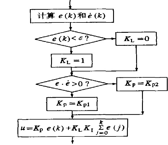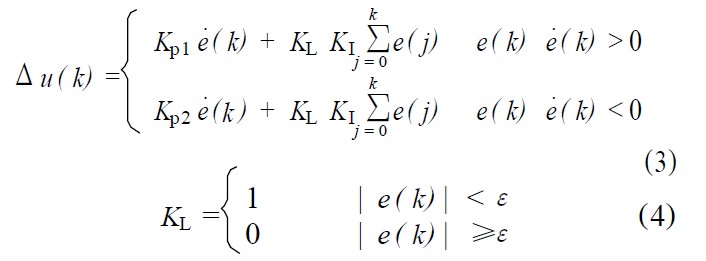 ③当│e(k)│≤ε时,即偏差值e(k)进入稳态区域时,加入积分环节,可保证系统的控制精度。