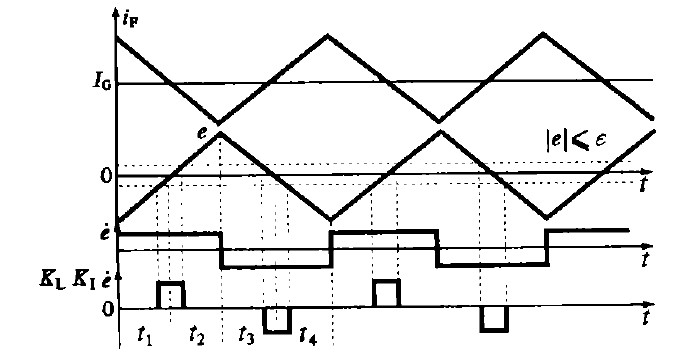 ④在区间1 和区间3 中,系统输出在调节器的作用下向给定值I G 接近。为了减小系统稳态误差,提高控制精度,采用大比例调节系数KP1使反馈电流i F 迅速接近I G.但KP1的增大会使系统的相对稳定性降低,甚至造成系统不稳定,所以在区间2和区间4 采用小比例调节系数KP2 ,以降低电流反馈值偏离给定值的速度。