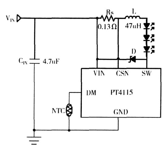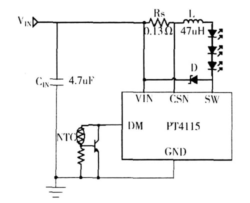 4) PT4115 内部自带过温?;すδ?,外部过温保护可设,对LED 实现双重保护;