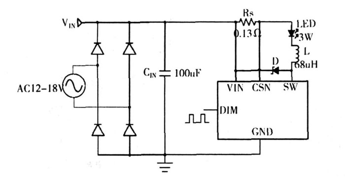 对于PT4115 (见图4) 即可以应用于12~18 V 的交流,也可应用在8 V~30 V 的直流。因此,应用范围更加广泛。并且,驱动电路简单,所需元器件均价格低廉。适合批量、市场化。
