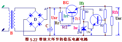输出电压的变化量△Usc 是很微弱的,它对调整管的控制作用也很弱,因此稳压效果不够好,带有放大环节的稳压电源,就是在电路中增加一个直流放大器,把微弱的输出电压变化量先加以放大,再去控制调整管,从而提高对调整管的控制作用,使稳压电源的稳定性能得到改善。图5-22 是带有放大环节的稳压电源电路。