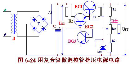 在稳压电源中,负载电流Ifz 要流过调整管,输出大电流的电源必须使用大功率的调整管,这就要求有足够大的电流供给调整管的基极,而比较放大电路供不出所需要的大电流,另一方面,调整管需要有较高的电流放大倍数,才能有效地提高稳压性能,但是大功率管一般电流放大倍数都不高。解决这些矛盾的办法,是给原有的调整管再配上一个或几个“助手”,组成复合管。用复合管做调整管的稳压电源电路如图5一24所示。