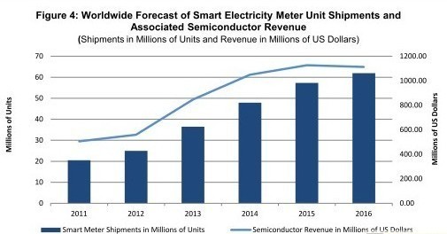 由于具有节能和改善电网效率的优点,预计电力企业将迅速采用智能电表,推动2011-2016年全球出货量增长两倍,并带动相关的半导体市场扩大一倍。