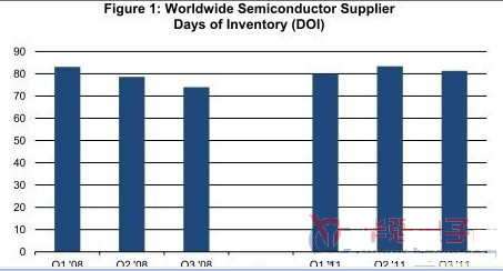 第三季度半导体库存天数(DOI)为81天,比第二季度的83天下降2.5%。自从2009年第四季度以来,库存天数就持续增加。2009年第四季度库存天数只有67天,由于需求在衰退时期蒸发,当时库存较低。此后,库存天数不断攀升,如图1所示??獯嫔仙?,一方面是因为需要补充衰竭的库存,同时也是为了满足不断增长的需求。第三季度库存约为369.6亿美元,低于第二季度时的372.9亿美元。