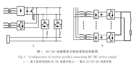 采用图1a所示的拓扑结构,系统需大容量不可调直流电源,一般可采用整流变压器降压,二极管整流并经电容滤波得到。这种结构虽可保证并联的每条支路有共同的直流电压输入,避免并联支路因直流侧输入电压不同而带来的不均衡,但该直流电源的容量大,电流达20KA,直流母线承受的负荷过重,前级AC-DC设备要求较高,不易实现。另外,输入端共用母线不利于实现完全意义上的独立电源???/a>的并联。因此,采用如图1b所示的AC-DC/DC直流电源并联的拓扑结构。