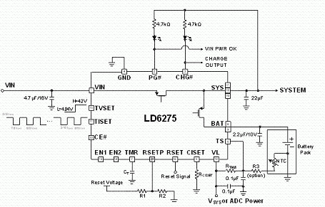 为满足低耗电可携式产品对于更精确、更安全的充电器应用需求,许多IC制造商发展出低成本线性充电器。图2是以通嘉科技的LD6275充电IC为设计范例,构成仅需少数外部零件的独立式线性充电器电路,其具备1.5A的最大充电电流。