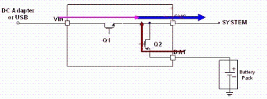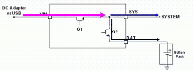 LD6275 具有适应性电源路径管理(Adaptable Power Path Management, APPM)功能,其为以供给系统端用电为主,对电池充电为辅,如图3所示;当系统用电超过输入电源的供给限制时,其电池亦能主动开启放电功能同时对系统端供给其所需之电能需求,如图4所示。