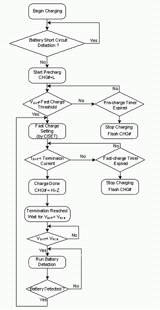 图6所示为锂离子电池充电器的标准充电流程,首先充电IC侦测是否有输出短路或是过载的保护模式,若系统一切正常接着侦测电池初始电压是否达到 3V以上,高于3V者就直接以快充模式进行高电流充电,若电池低于3V者,进入预充电模式,以快充的10%进行充电,唤醒电池并避免电池损坏。在预充电阶段,仍随时侦测电池电压,达到3V后可随即切入快充模式。