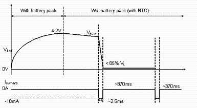 使用者亦有可能在充电或式充电完毕后,在未将电源移除的情况下,即抽离电池的情况。为避免造成危险,IC内部应具有如图7, 8的电池存在侦测机制。充电IC会以短时间脉冲(每370ms产生2ms的脉冲)方式抽取电池电流,此时若电池存在,则侦测到的电池电压应大于一预设阀值;若电池已切离,则充电IC侦测到一低电压,即可判定为电池断开状态,并将电池端电压切断,?;な褂谜甙踩?br />