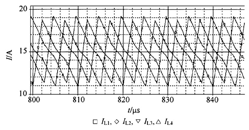 图6 所示为滤波电感的电流波形, 从图6 可以看出, 4 个滤波电感的电流轮流充电, 如果一个滤波电感在充电, 其余3 个电感必须在放电, 在死区时间内, 4 个滤波电感都在放电。