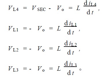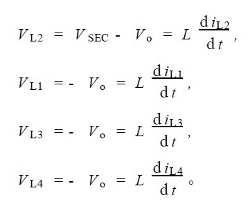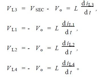 4) S2 导通, S1 截止; S6 截止, S3 , S4 , S5 均导通。由于S3 , S4 , S5 的导通, 第二变压器副边绕组上端为零电位,第一变压器副边绕组上、下端均为零电位, 电感L4 上电流上升, L1 , L2 , L3 上电流下降。