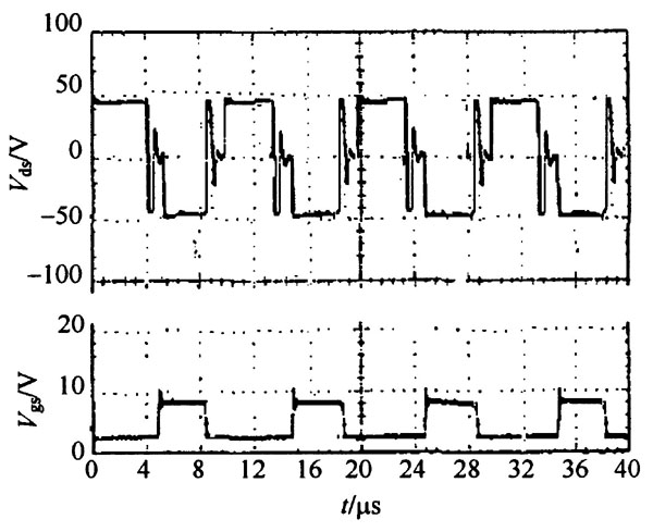 通过理论研究及仿真分析, 可以看出, 交错并联的低压大电流DC - DC 变换器具有良好的性能,在输出为1125 V/ 60 A 的情况下, 输出电流纹波可以降到很小。为了进一步说明这种拓扑结构的可行性, 用实验结果验证。实验电路见图4 , 实验参数和仿真相同, 最后得到如图9 所示的实验波形。图9 中, V gs为一次侧一个MOSFET 的门极驱动电压波形, V ds则为相应的MOSFET 的栅源电压波形,从图9 可以看出, 实验结果所得波形同图5 的理论分析结果十分吻合, 所提出的方法是可行的。其中, 变压器选用R2 KB 软磁铁氧体材料制作的GU22 磁心, 原副边的匝数分别为8 匝和1 匝; 电感选用宽恒导磁材料IJ 50h 制作的环形铁心T5 - 10 - 215 ,匝数为8 匝。