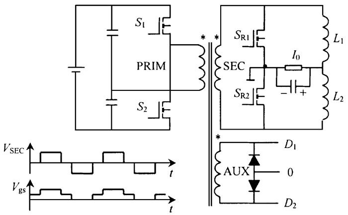 结构中的同步整流器均按外加信号驱动处理,使控制变得很复杂, 但在这种半桥- 倍流拓扑结构中使用简单的自驱动方式很困难, 因为, 在这种结构中, 如果直接从电路中取合适的点作为同步整流器的驱动信号, 在死区时间内当这个驱动信号为零时, 同步整流器就会截止。为了在半桥- 倍流拓扑结构中使用自驱动方式, 就必须使用到辅助绕组。