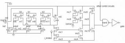 图3为本文所提出的新型电流极限比较器具体电路。其中M0--M11构成电流镜网络,用于设定电源所需的几种极限电流值。Mc1--Mc10构成电流比较器,使极限电流与检测电流直接比较产生不同的占空比(即不同的导通时间)。与非门和倒相器构成控制电路,直接驱动功率MOS管,控制其导通或关断。此电流极限比较器采用电流镜结构代替传统的电阻网络产生电源所需的几种极限电流,采用cascode结构组成电流比较器代替传统的电压比较器使两种电流直接比较。