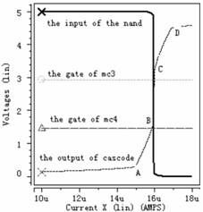 现以图4为例阐述电流极限比较器的工作情况。此时极限电流为4μA,其虚线代表cascode结构的输出电压波形,黑色实线代表反相器的输出电压波形即与非门的输入电压波形,另外两条点划线分别代表cascode结构中Mc3和Mc4的栅电压波形。