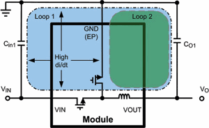 环路2是在内部高端MOSFET的关断时间以及低端MOSFET的导通时间内形成的。内部电感器中存储的能量流经输出旁路电容器和低端MOSFET,最后返回GND(如图1所示)。两个环路互不重叠的区域(包括环路间的边界),即为高di/dt电流区域。在向转换器提供高频电流以及使高频电流返回其源路径的过程中,输入旁路电容器(Cin1)起着关键作用。