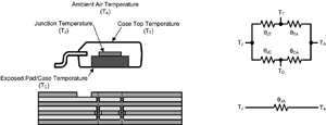 从半导体结到这些器件外封装的热阻抗(θJC)为1.9℃/W。虽然达到行业领先的θJC值就很理想,但当外封装到空气的热阻抗(θCA)太大时,低θJC值也毫无意义!如果没有提供与周围空气相通的低阻抗散热路径,则热量就会聚集在裸焊盘上无法消散。那么,究竟是什么决定了θCA值呢?从裸焊盘到空气的热阻完全受PCB设计以及相关的散热片的控制。