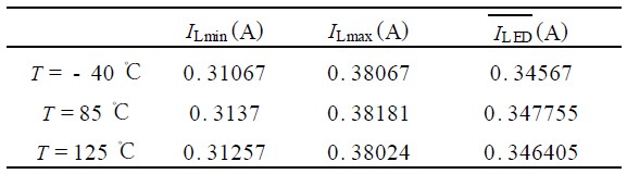 在V in = 12V 时,对LED 驱动电流进行温度特性仿真,三次仿真波形结果分别如表2 所示。 可以看出,芯片的温度特性较好。
