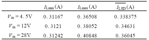 分别在V in = 2. 5V , V in = 28V 的情况下,再次对L ED 驱动电流进行仿真,三次仿真数据结果分别如表1 所示。