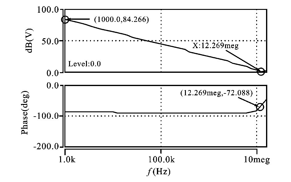 由运放的频率特性仿真图5 可知,增益达到84. 266dB ,相位裕度108°,单位增益带宽约12MHz ,满足电路要求。