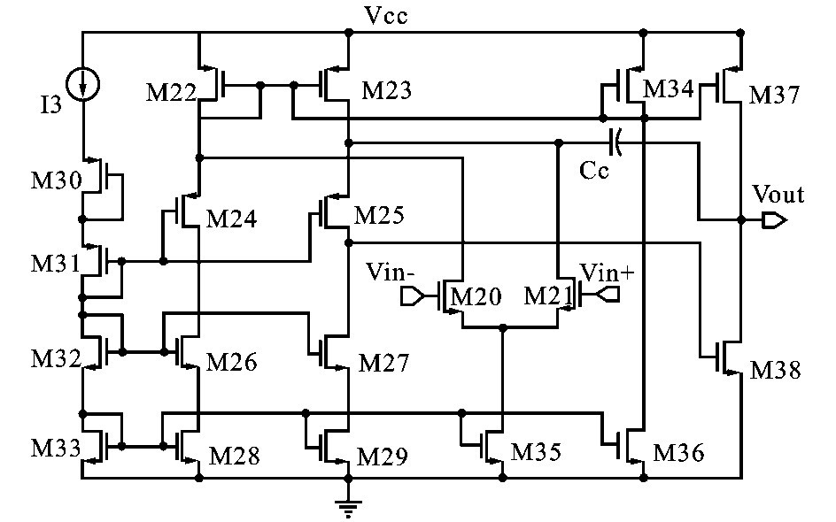 以上分析可知运算放大器起着重要作用,其必须具有较高的增益,才能使A 点电压精确跟随参考电压,从而准确设定B 点电平和滞环电压大小。 另外由于V out的变化频率与系统开关频率相同(系统的最大开关频率约为2MHz) ,使得流过M1 的电流也相同频率在IM1和I′M1之间快速切换,所以运放的单位增益带宽须大于系统的最大开关频率。 设计的运放结构如图4 所示,采用折叠式输入结构,可以获得较大的共模输入电压范围。